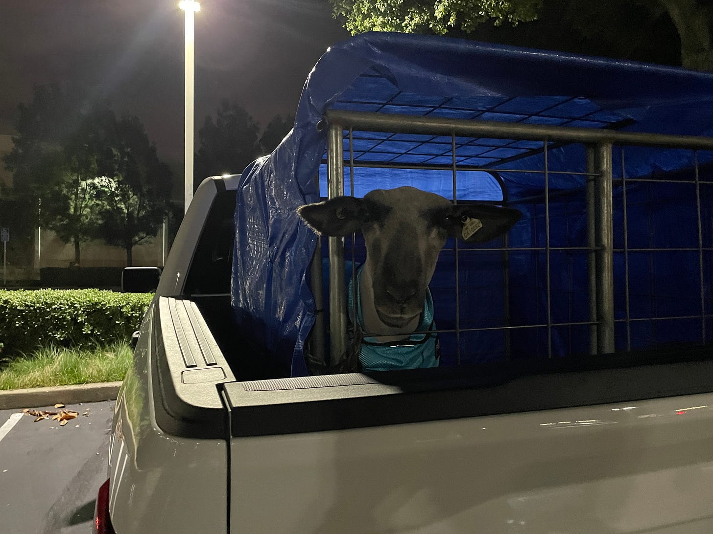 This is a good thing.A few weeks ago, Jim and I took my dad out to eat at a local Thai restaurant. We were pretty shocked, when we opened our car doors, to hear extremely loud baaaaaaa’ing. I went investigating, and I found a pretty pissed-off looking sheep hanging out in her crate in the back of a pickup truck.